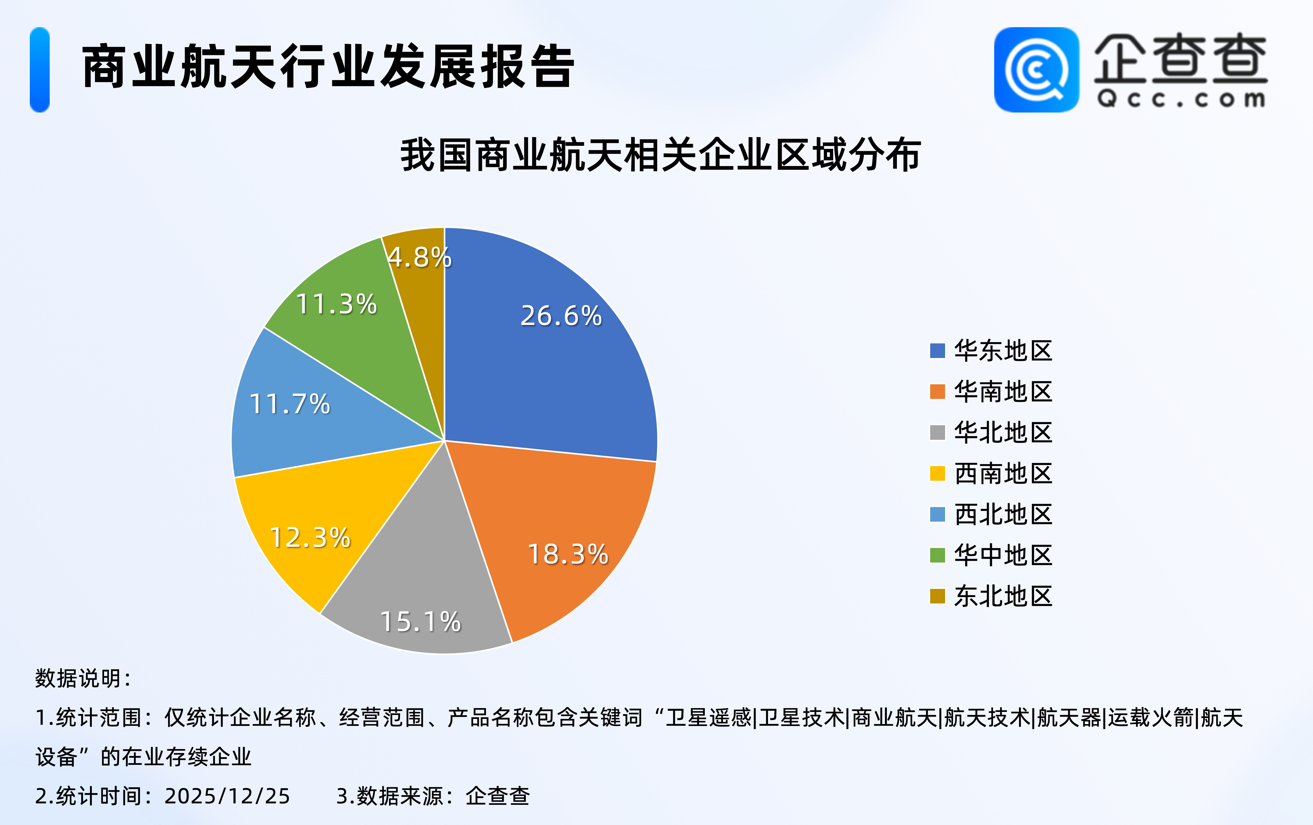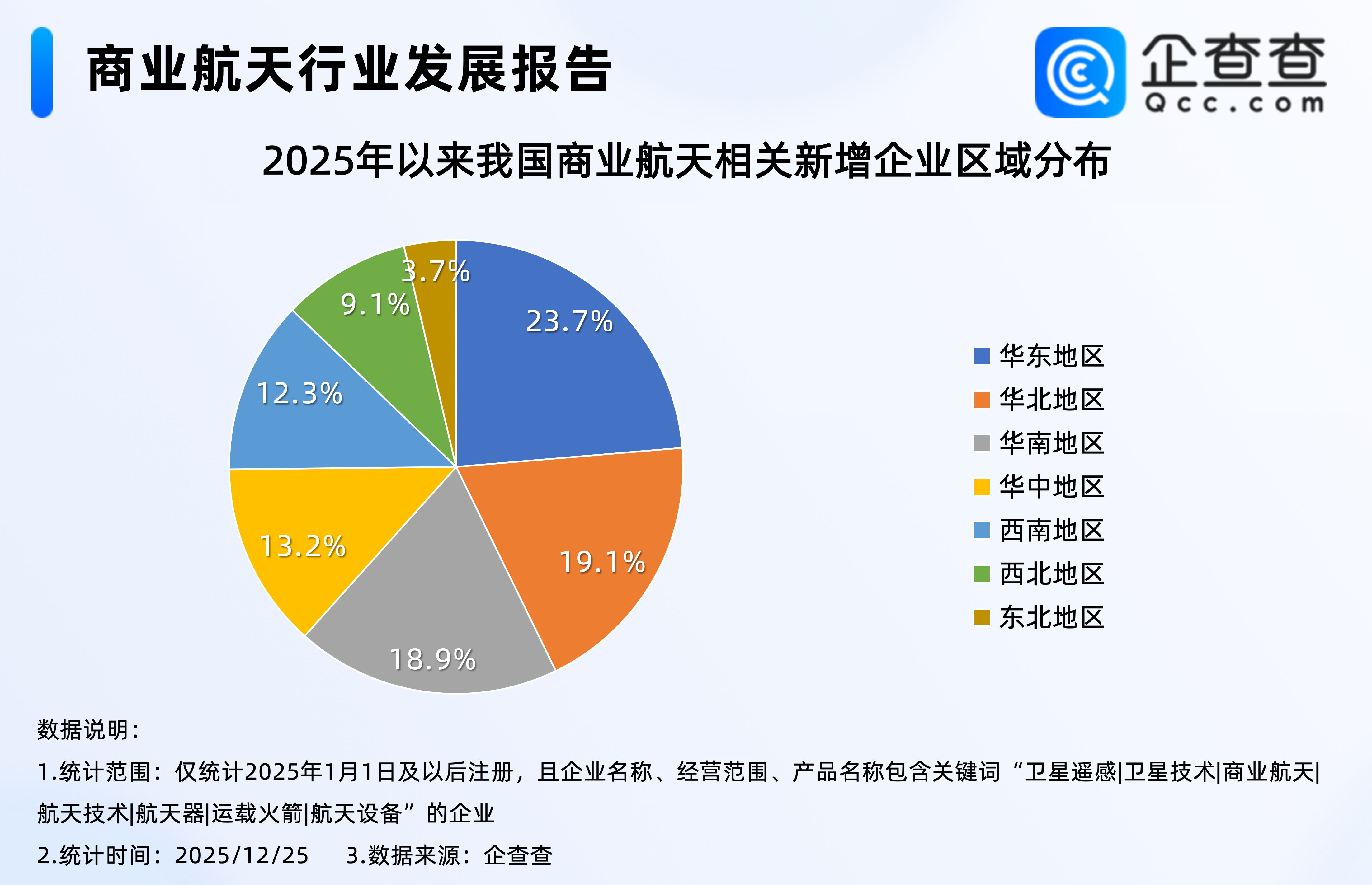 企查查数据显示,2020年以来,我国商业航天相关企业注册量基本逐年增加,2023年全年,我国注册1.72万家商业航天相关企业,达近五年注册量峰值;截至12月25日,2025年我国已注册2.48万家商业航天相关企业,其中前11月注册2.28万家,相比2024年同期大幅增加57.5%。3.从今年新注册企业区域分布来看:华北排第二,占比19.1%